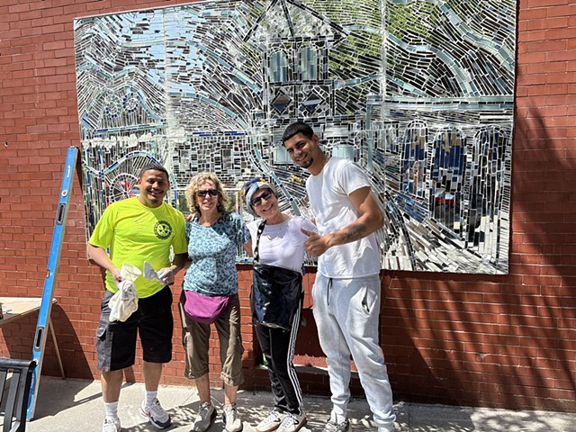 “We Are Brookline: Reflections and memories of Brookline, Then and Now” was Installed June 3, 2025 at 2 Harvard Street, Brookline Village. Iconic landmarks in Brookline Village are incorporated into the outlines of this mosaic. In the foreground, two local women from the turn of the century, are each seated by a window, frozen in time within photographic glass negatives.